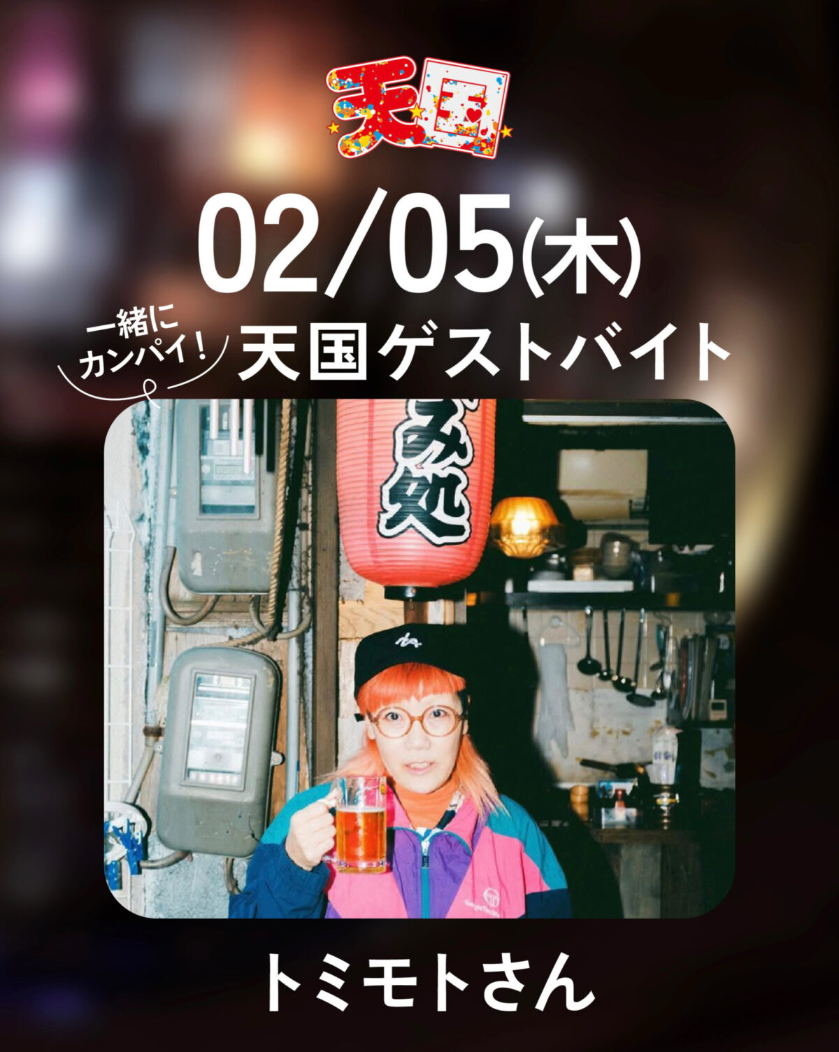 イベント 2026.01.29 2/5(木)“夜の秘境”こと肥後橋の立ち食い小皿焼肉「天国」で、ヘンとネン編集長・トミモトリエが1日店長(ゲストバイト)します。19:00から出勤予定なので遊びにきてくださ~い。シャンパン入れてくれたらとても感謝します。2/2(月)~8(日)まで9周年ウィークとして、いろんなゲストバイトが入れ替わるみたいですよ! 詳細はこちら トミモトリエ