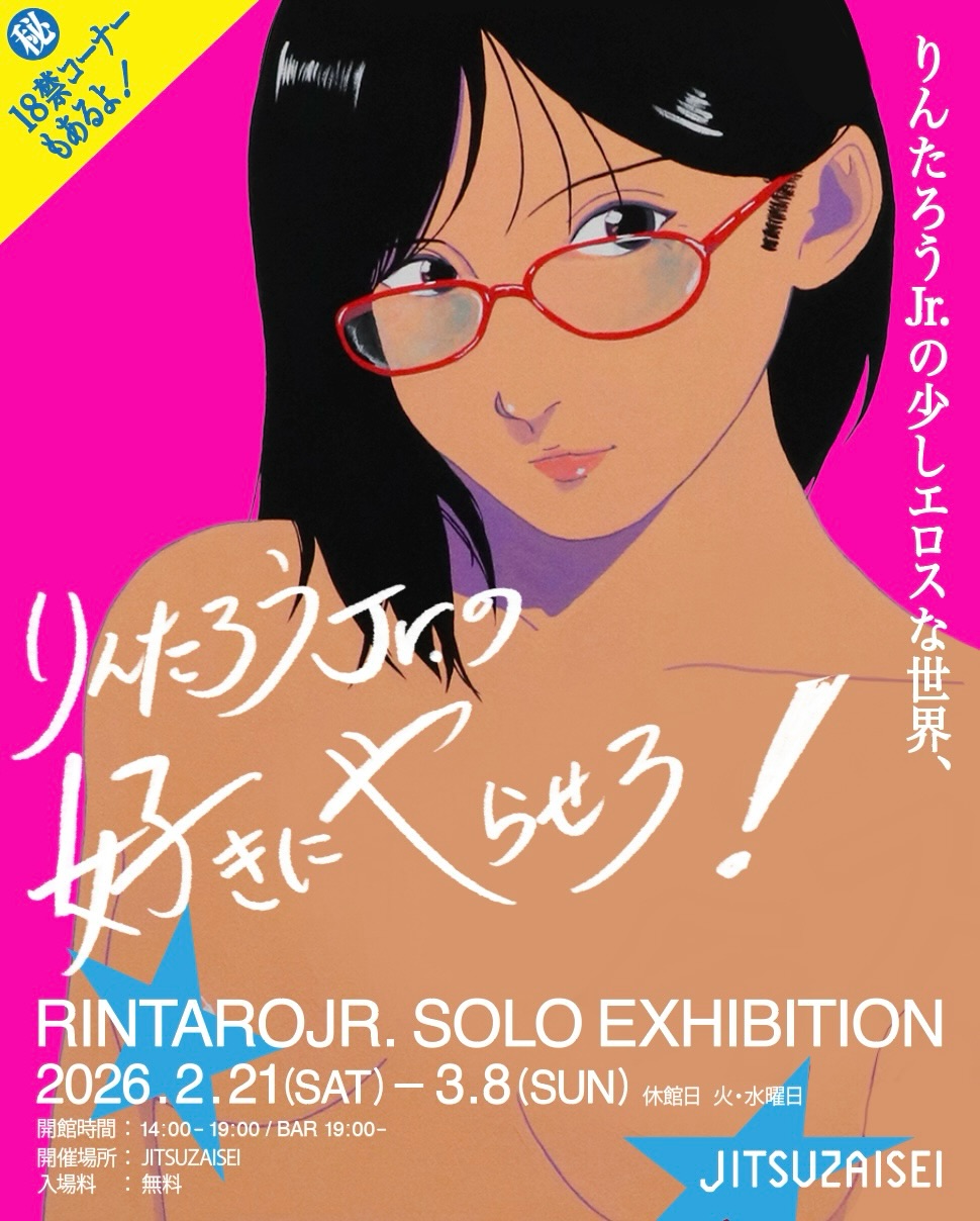 イベント 2026.02.12 2月21日(土)〜3月8日(日)、スーパー作家で超生命体のりんたろうJr.が個展「りんたろうJr.の好きにやらせろ!」を開催します。会場は今里[JITSUZAISE]にて、入場無料!バックダンサーを迎えたプロモーション動画も要チェック!【18禁コーナー】もあるみたい。セクシーすぎたらごめんなさい〜! 詳細はこちら はまだみか