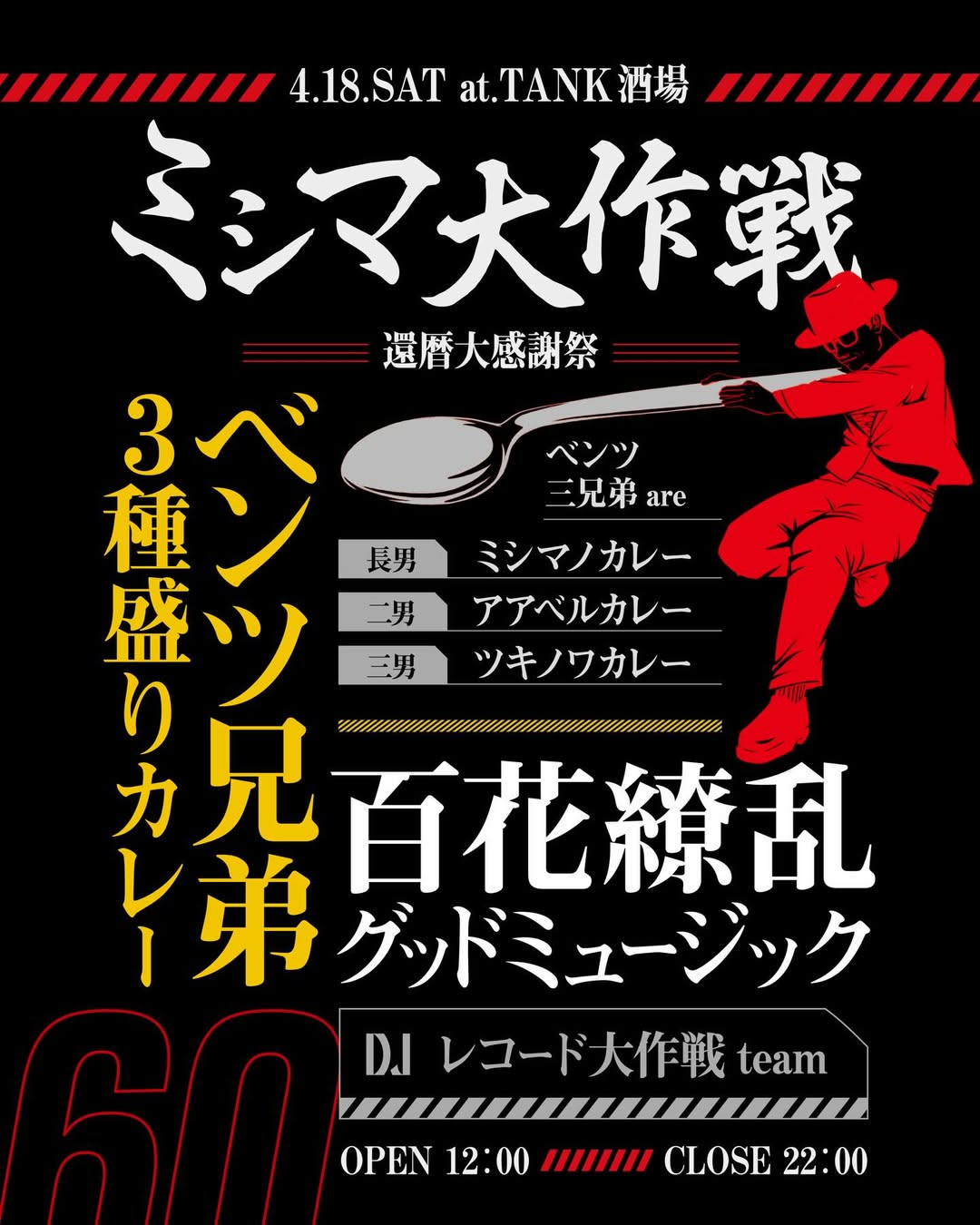 イベント 2026.04.09 「口癖はカレー」主宰、「関西カレー保安協会」会長の“カレービッグボス”こと三嶋さんが祝60歳!4月18日(土)TANK酒場で「ミシマ大作戦~還暦大感謝~」が開催されます!アアベルカレー安倍ちゃん、ツキノワカレー菅ちゃんとのベンツ三兄弟による「三種ベンツ盛りカレープレート」を限定数で提供!レコード大作戦チームのDJ陣と一緒に、この日、晴れて還暦DJとしてデビューする三嶋さん。カレーと酒と音楽でビッグボスの還暦をお祝いしよう! 詳細はこちら トミモトリエ