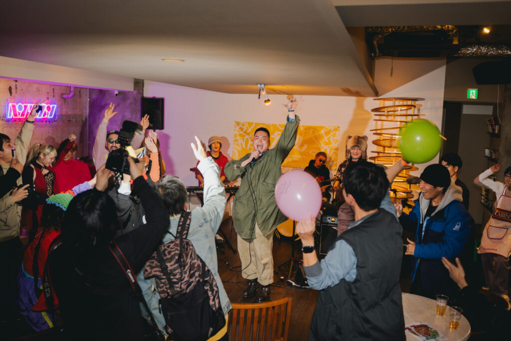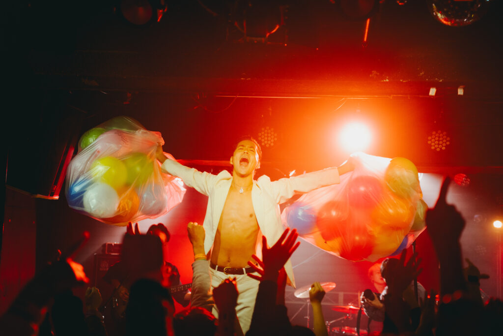 「ライブで風船飛ばすのが夢やってん」と語る儀間建太さんの声を合図に、カラフルな風船が宙に舞います。