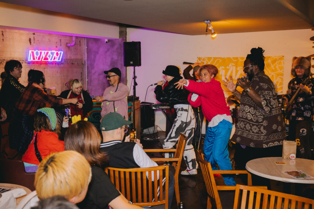 ミュージシャンのONIさんも登場すると、二人の歌声とDUCK HOUSEの音楽が掛け合い、どんどん熱を帯びていきます。BONさんが引き連れてきた後輩ダンサーに、今日の出演者、出店者、オーストラリアからの観光客も、みんなステージに上がります。