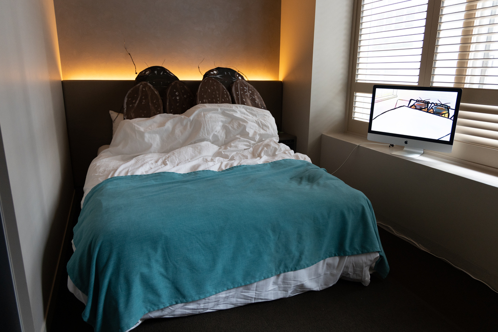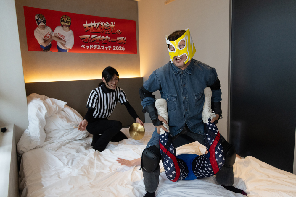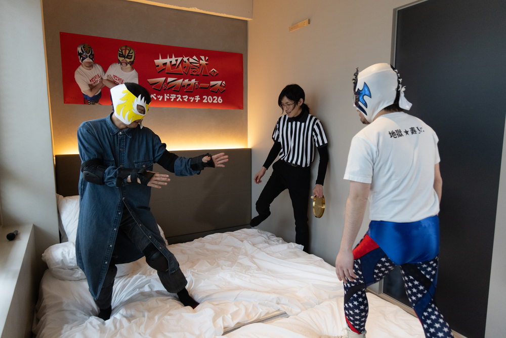 これまた盛り上がりを見せていたのが、「ベッドでプロレスする部屋」。スーパー作家・りんたろうJr.とデザイナー・フルカワコウキによるシュミレスラー「地獄のブラザーズ」。