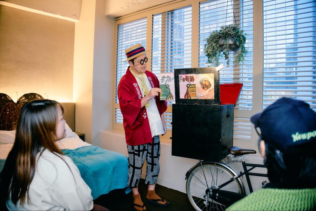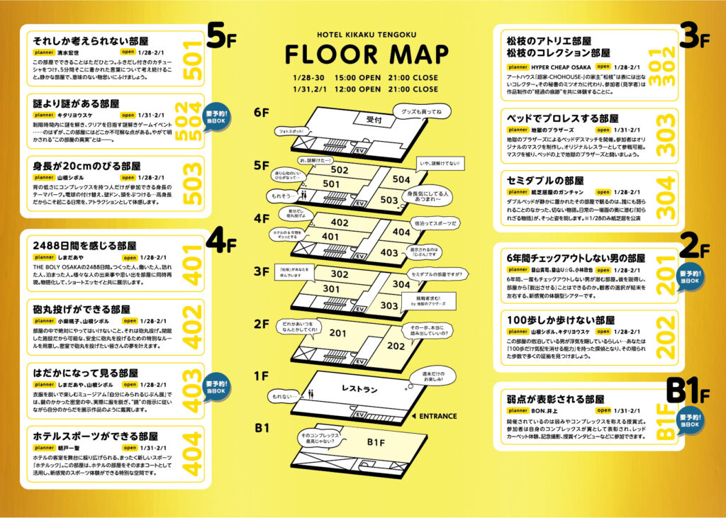 そんな閉館後のホテルに、紙芝居屋、エッセイスト、ゲームデザイナー、劇作家、ダンサー、謎解きクリエイターなど……ジャンル問わず関西中のクリエイターたちが一斉にチェックインし、プランナーとして自由に考えた企画を、全客室・全館にわたって展開。