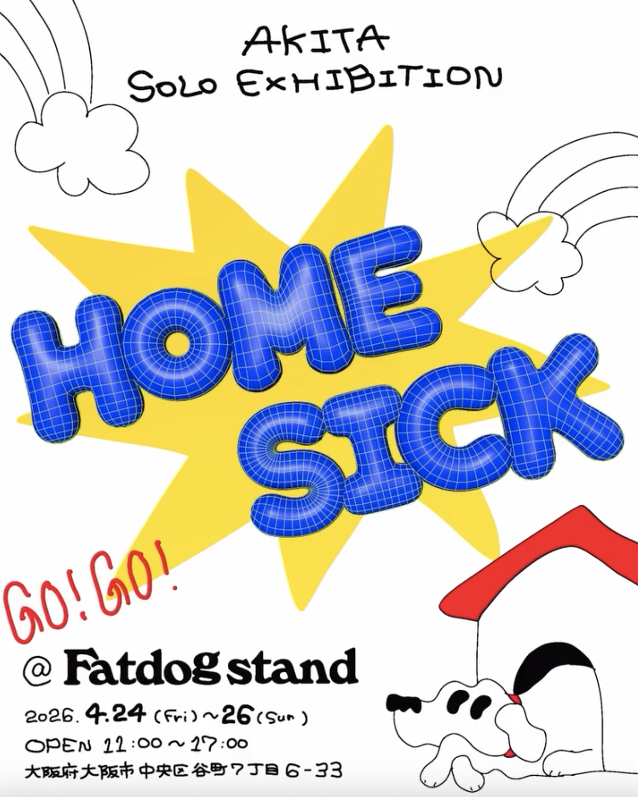 イベント 2026.04.07 4/24(金)~26(日)、大阪・谷町のホットドッグスタンド[FAT DOG STAND]で、AKITAちゃんはじめての個展『HOME SICK』が開催!POPでキュートな3D作品が店内いっぱいに並ぶみたいで、空にはホットドッグが飛んでるかもしれないそうです……気になりすぎる……!最強ホットドッグを食べながら、AKITAちゃんの作品にまみれましょう~~~! 詳細はこちら はまだみか
