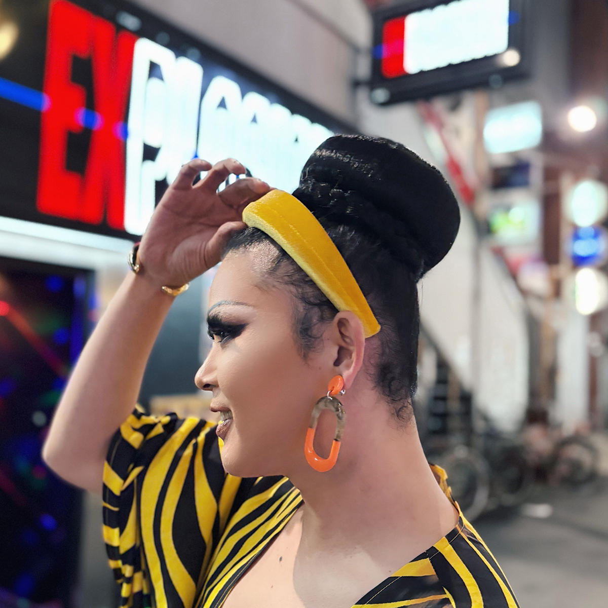 私のトレードマークになっている太めのカチューシャです。着けるようになったのは3〜4年前。テレビ出演のお仕事が増えたのがきっかけでした。マツコ・デラックスさんやミッツ・マングローブさんのように「自分といえばこれ」という定番のスタイルがほしいと思って。ただお団子ヘアにしただけではインパクトがなく、アクセントとしてカチューシャをプラスしたんです。カチューシャ選びで大事なのは、厚みがあり、ボリューミーかどうか。私は骨格が大きいので、小さいものではちぐはぐになっちゃう。それと、前から見たときにお団子の付け根が隠れるくらいのボリュームが、一番バランスがいいんですよ。みなさんの基準からしたら「ちょっと大げさかも」くらいデカいくらいでちょうどいいくらい。厚さは2〜3センチあるものを選ぶことが多いです。
