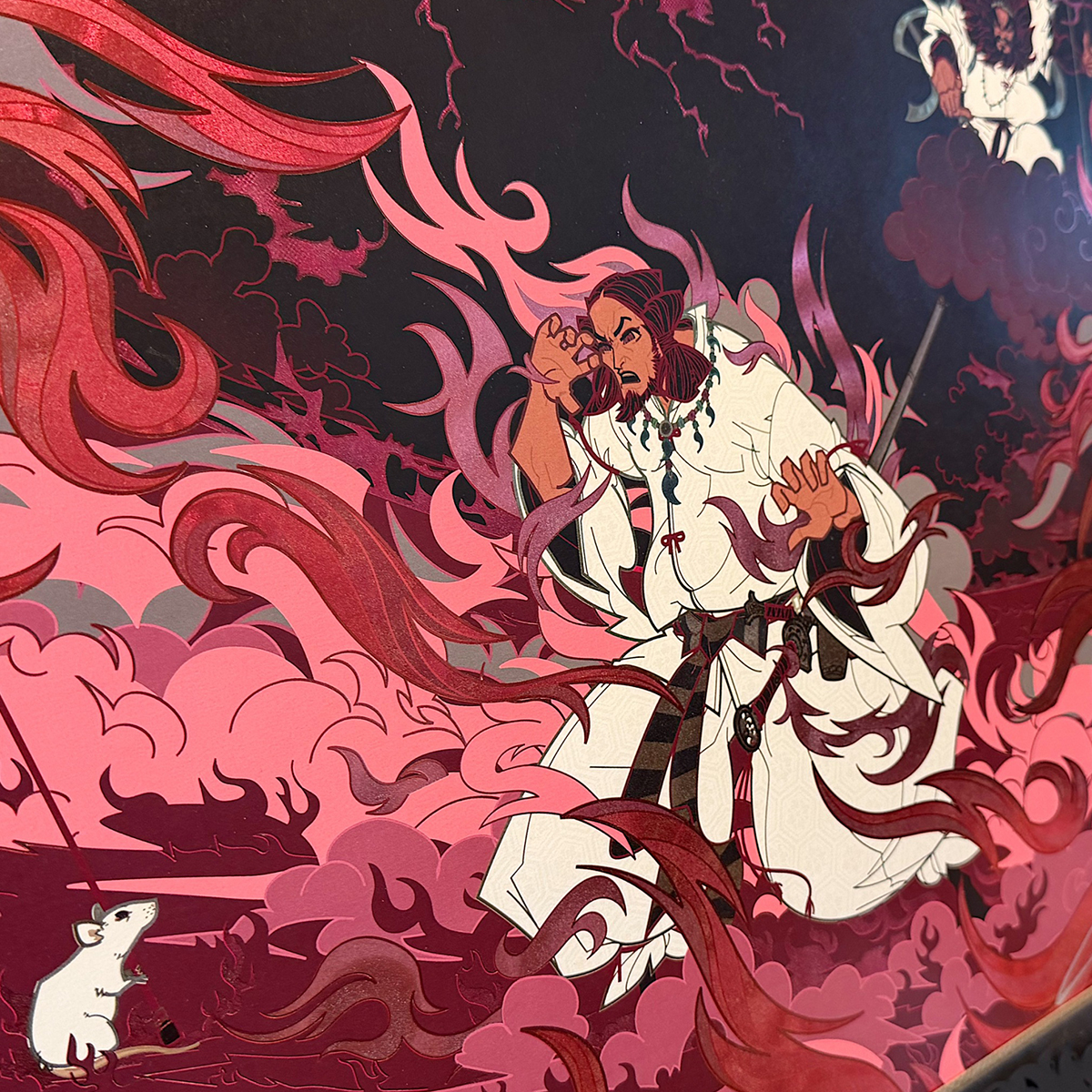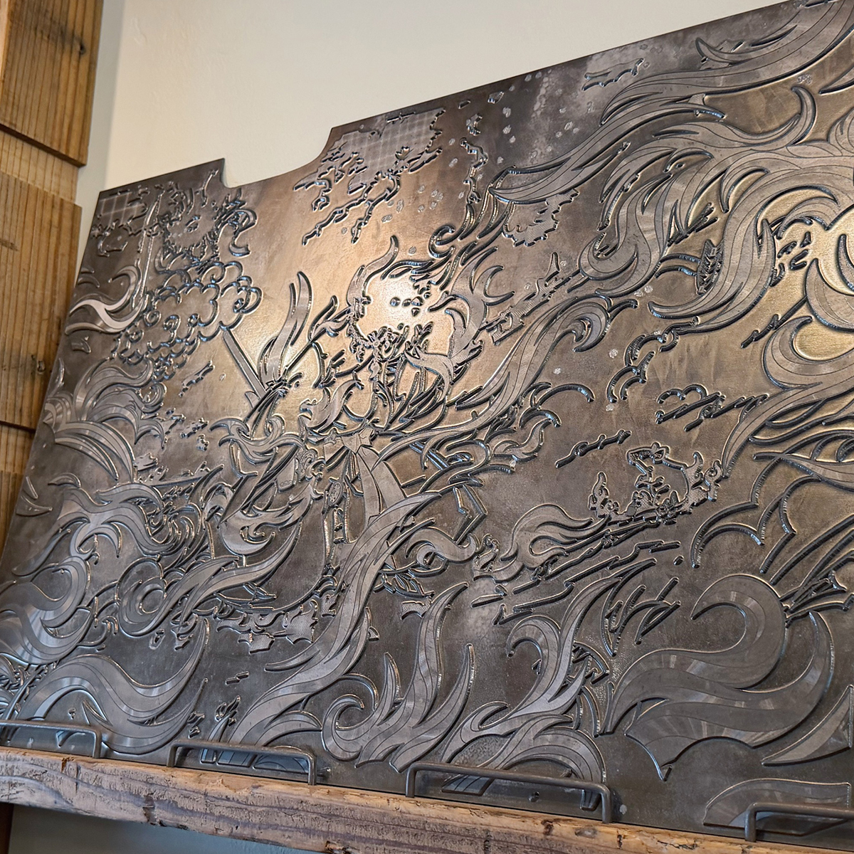 うちが独自開発した特殊箔印刷技術「Sプリズムプリント®」を用いた、上田バロンさんとコラボしたアート作品です。印刷物の上に箔を捺すのではなく、箔の上にカラー印刷をのせる手法。その箔を捺す金型に「微細なエンボス(凹凸)模様」を仕込んで、見る角度によって色が変化したり立体感が出るように、光の反射を計算してコントロールしてます。