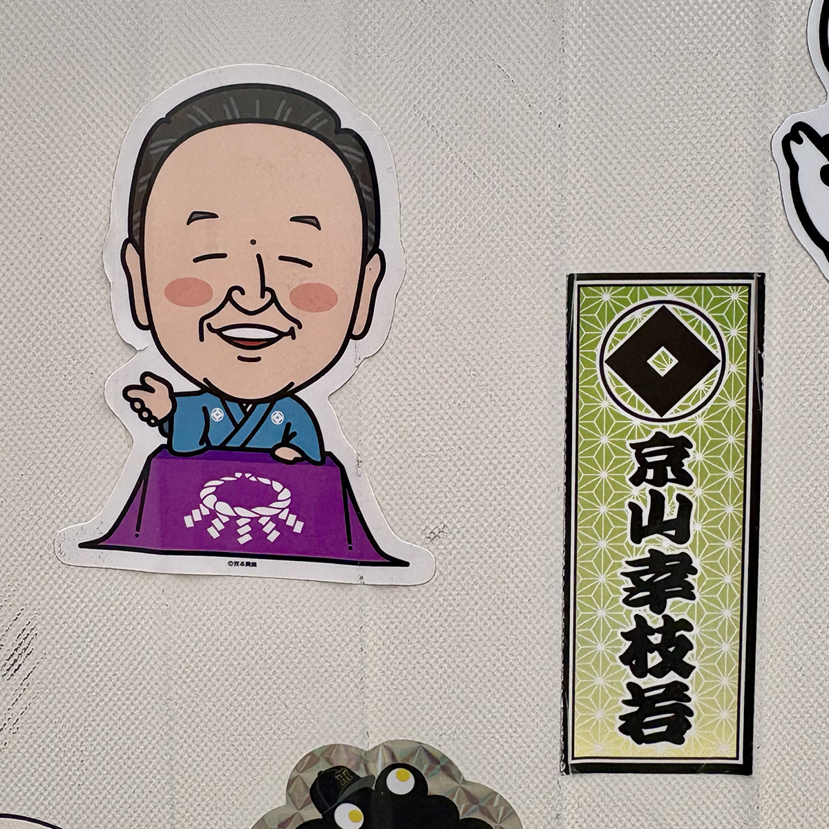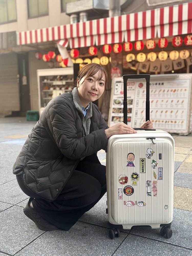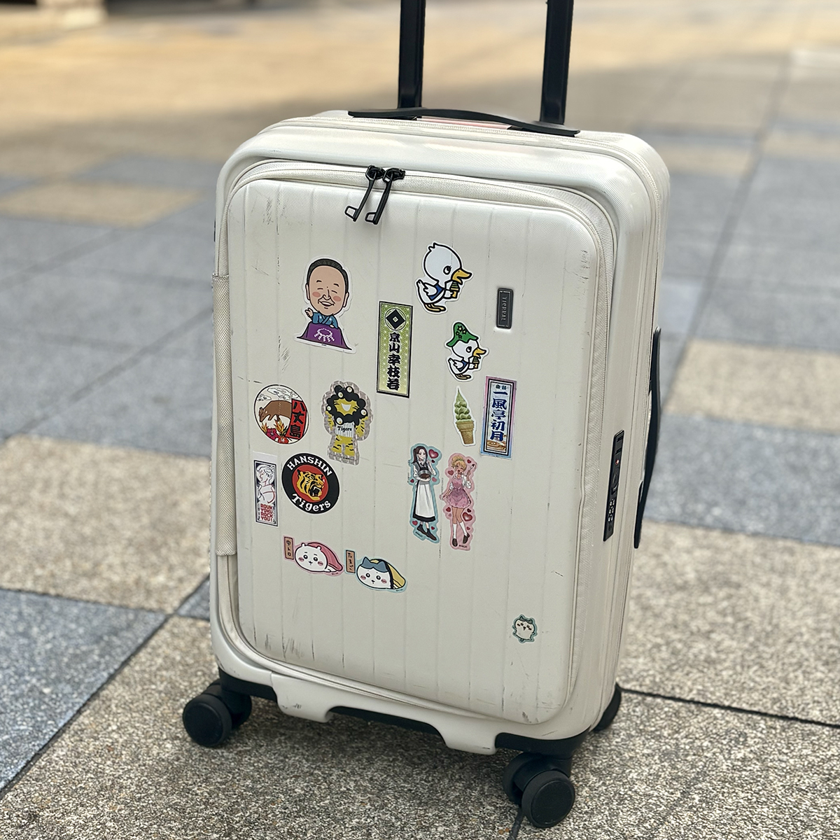 一番はボディ前面が開くフロントオープンポケットが搭載されていること。演者でいっぱいの狭い楽屋で開いても、通常のスーツケースに比べて半分しか場所を取らないことは大きなメリットです。ローラーにストッパーがついているのもありがたいですね。電車移動の際などに眠ってしまっても、周囲に迷惑がかからないですから。シンプルなホワイトなので、師匠である京山幸枝若のイラスト、漫画家として活動する妹の作品など、思い入れのあるステッカーが映えるところもお気に入りです。