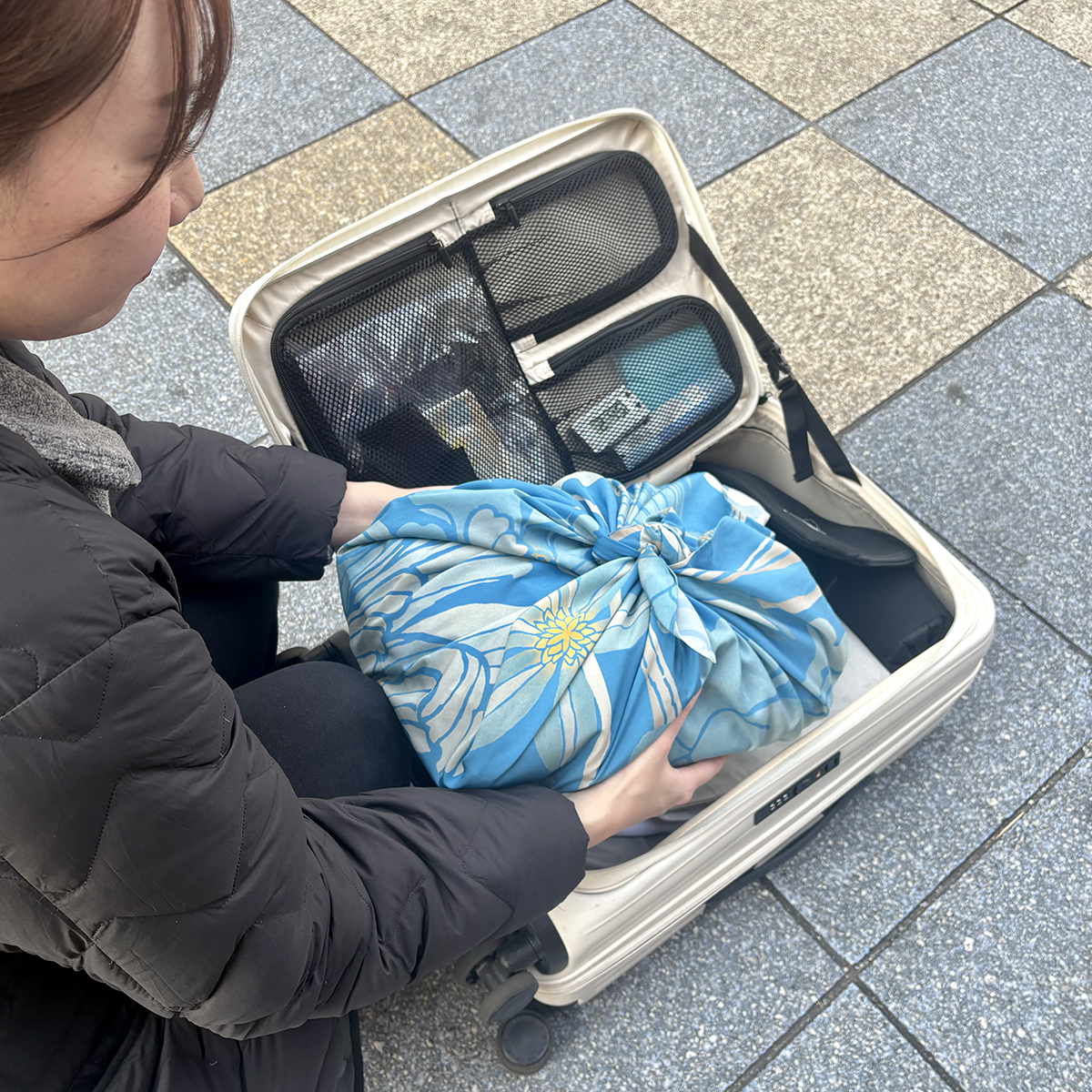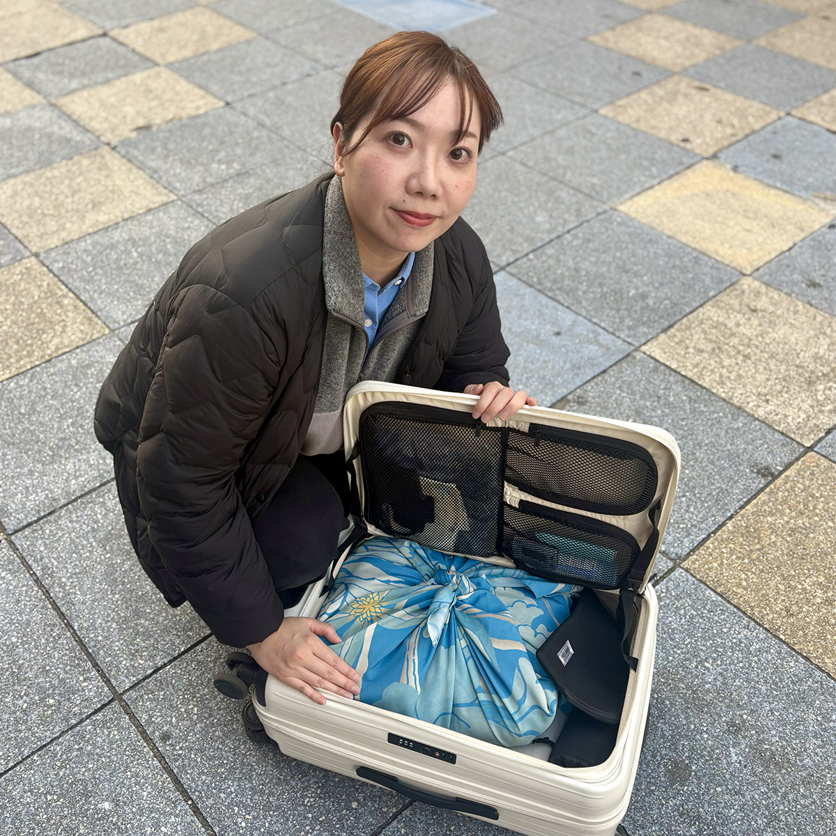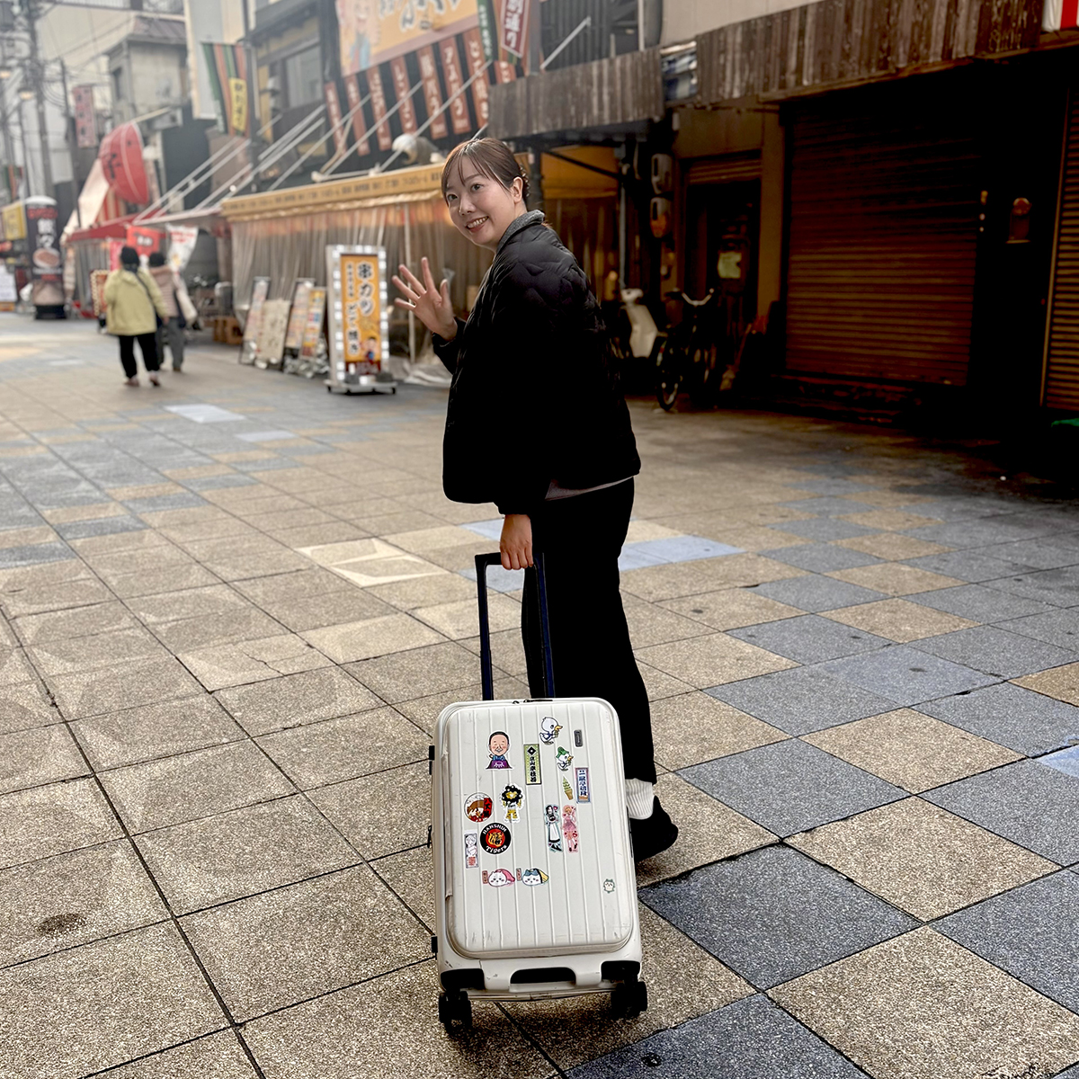一番はボディ前面が開くフロントオープンポケットが搭載されていること。演者でいっぱいの狭い楽屋で開いても、通常のスーツケースに比べて半分しか場所を取らないことは大きなメリットです。ローラーにストッパーがついているのもありがたいですね。電車移動の際などに眠ってしまっても、周囲に迷惑がかからないですから。シンプルなホワイトなので、師匠である京山幸枝若のイラスト、漫画家として活動する妹の作品など、思い入れのあるステッカーが映えるところもお気に入りです。