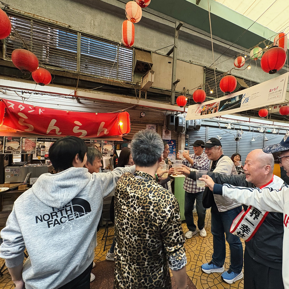 シャッター街を復興する「新世界市場屋台街プロジェクト」の初代店舗として2022年にこの屋台をスタートしたんですが、最初は本当に人が来なくて、売り上げがない日もありました。でも、1時間に1回の乾杯を始めたことで、たまたま居合わせた人たちが仲良くなって、常連さんになって。あと、乾杯をしていると足を止めて動画を撮る人も多いので、SNSを見て来る人も多いですね。こんな小さな屋台なのに、今や50人以上ひしめき合うこともあります。