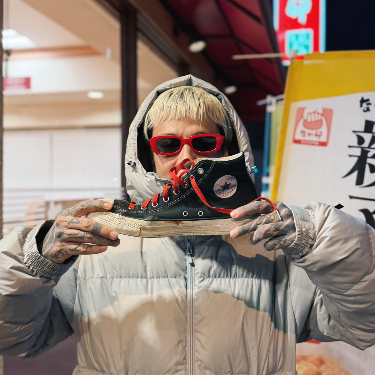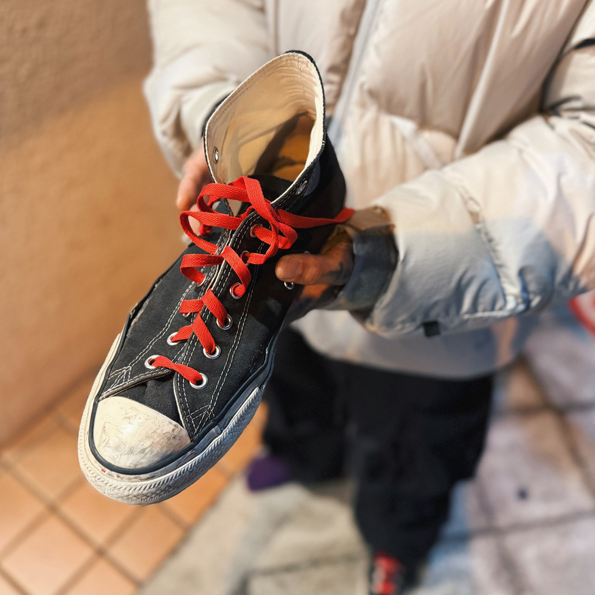 昔サッカーやってた時の後遺症で足首がグラグラするんですよ。だからハイカットの方が固定されて調子がいい。「ブーツ履かないの?」って言われるんですけど、僕、ドクターマーチンが死ぬほど似合わないんですよ。鋲ジャンも死ぬほど似合わない。好きだけど似合わないんです。だから、僕の中ではこのコンバースが、ドクターマーチンみたいなものですね。