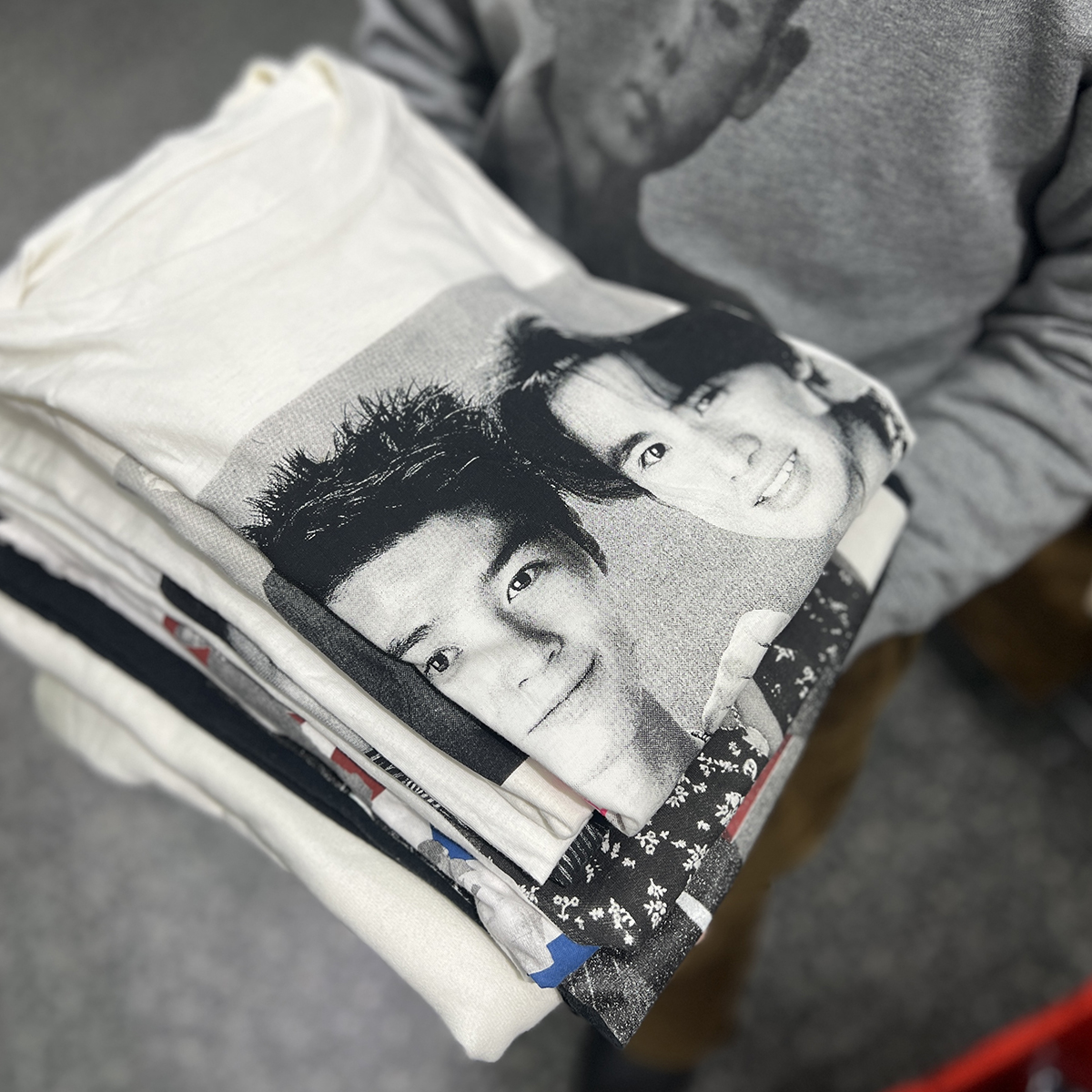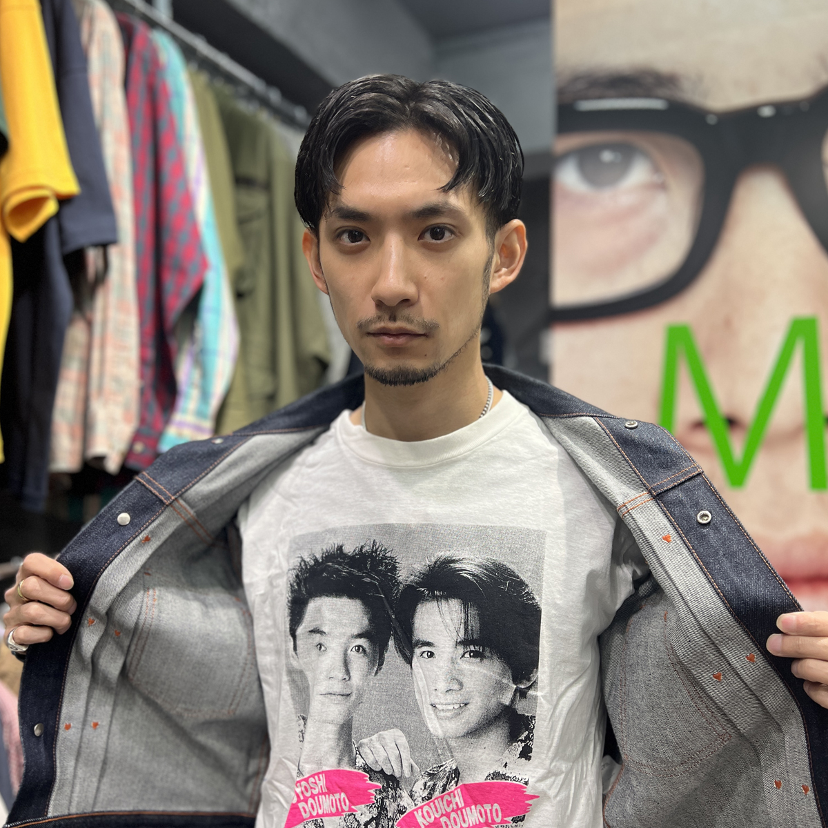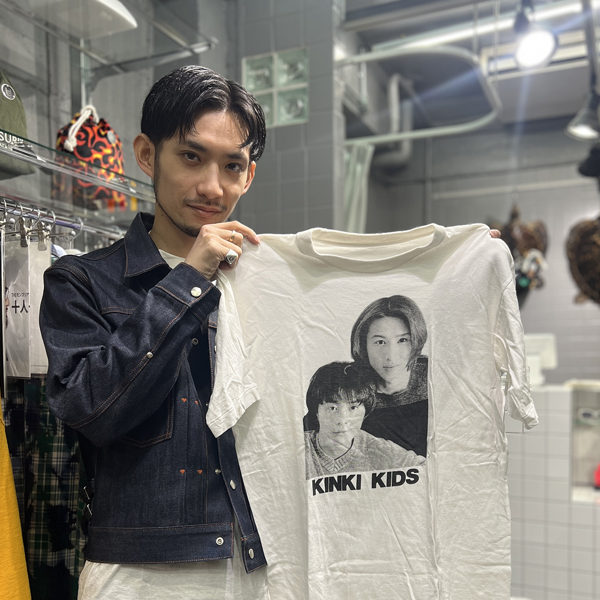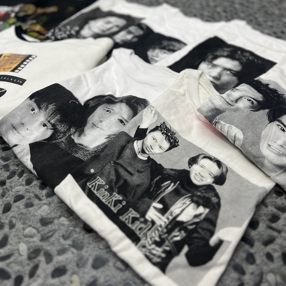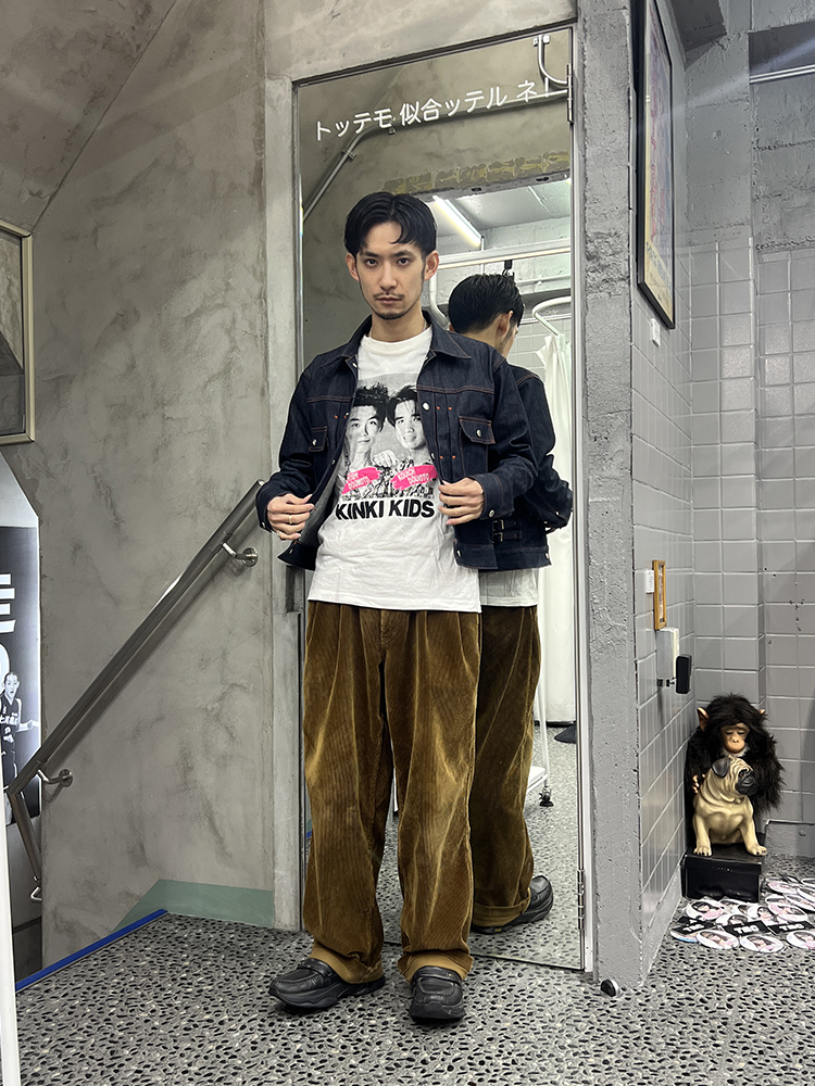 前提として、あくまでファッションアイテムとして身に着けることにこだわっています。例えばジャケットの下に着たとき、さりげなく顔が見えるのがいいんです。もちろん、ライブグッズなど、オフィシャルアイテムが出ているのは知っています。ただ、本人たちの顔が前面にプリントされているようなものはあまりないんですよ。古着には音楽系というカテゴリーがあって、特にベートーヴェンの顔がプリントされたスウェットは有名です。僕は、アイドルTをその派生形のようなノリで捉えていて、非公式ならではのチープさも含めて面白いと思っています。ただ、KinKiのお二人の活動は年々アート色が濃くなってきているので、図らずもその文脈と合致してきている、というのもそそられるんですよね。「それ何なん?」といじられたり会話のフックになったり、ちょっとクスッとなるくらいがちょうどいいんです。